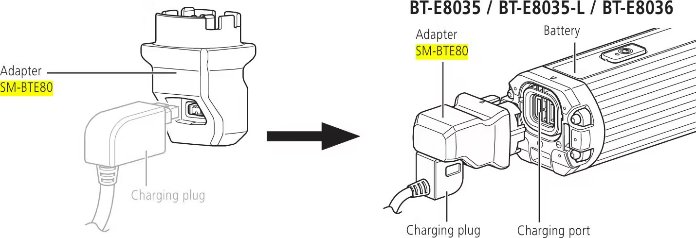 De Shimano SM-BTE80 is een laadadapter (tussenstuk) die nodig kan zijn voor het opladen van bepaalde Shimano STEPS-accu’s wanneer deze uit de fiets zijn verwijderd. Bij deze accutypes past de laadstekker van de oplader niet rechtstreeks op de accu. In dat geval gebruik je de SM-BTE80 als verbindingsstuk tussen de oplader en de accu, zoals te zien is op de afbeelding.